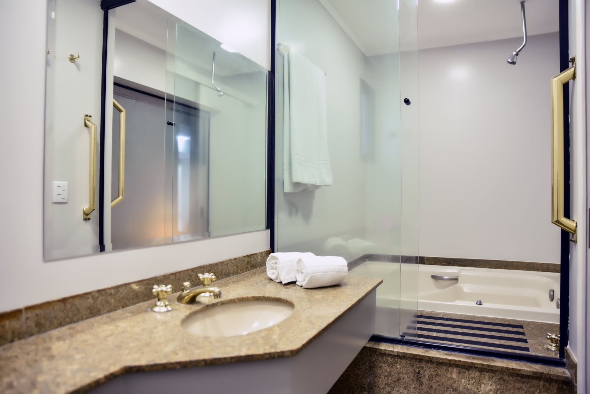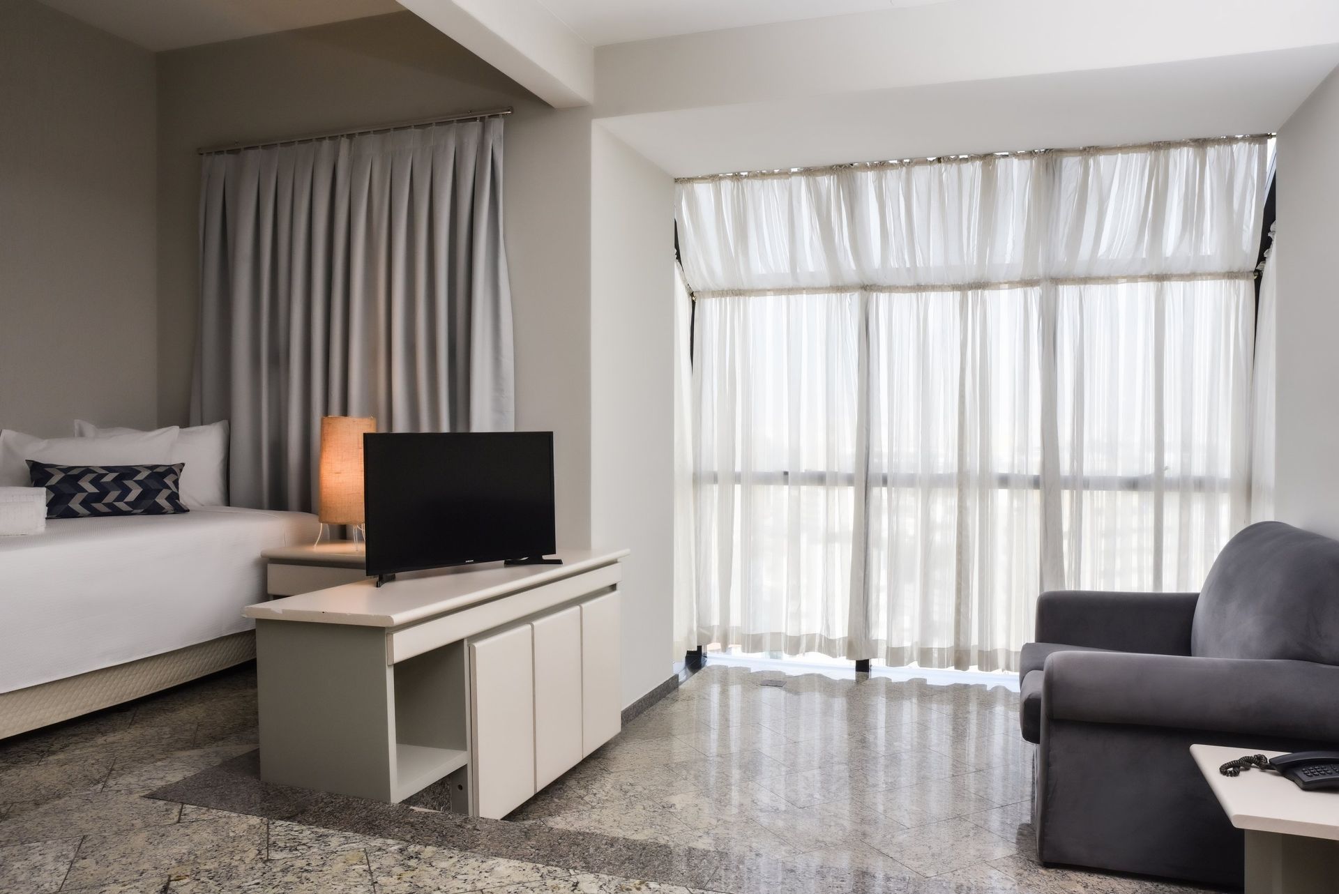 Nossas suítes são amplas e equipadas com ar-condicionado, TV a cabo, Wi-Fi gratuito, cofre e cozinha não equipada, proporcionando todo o conforto que você precisa. Para momentos de lazer, contamos com uma piscina ao ar livre, sauna, academia, pista de cooper e quadra de tênis.